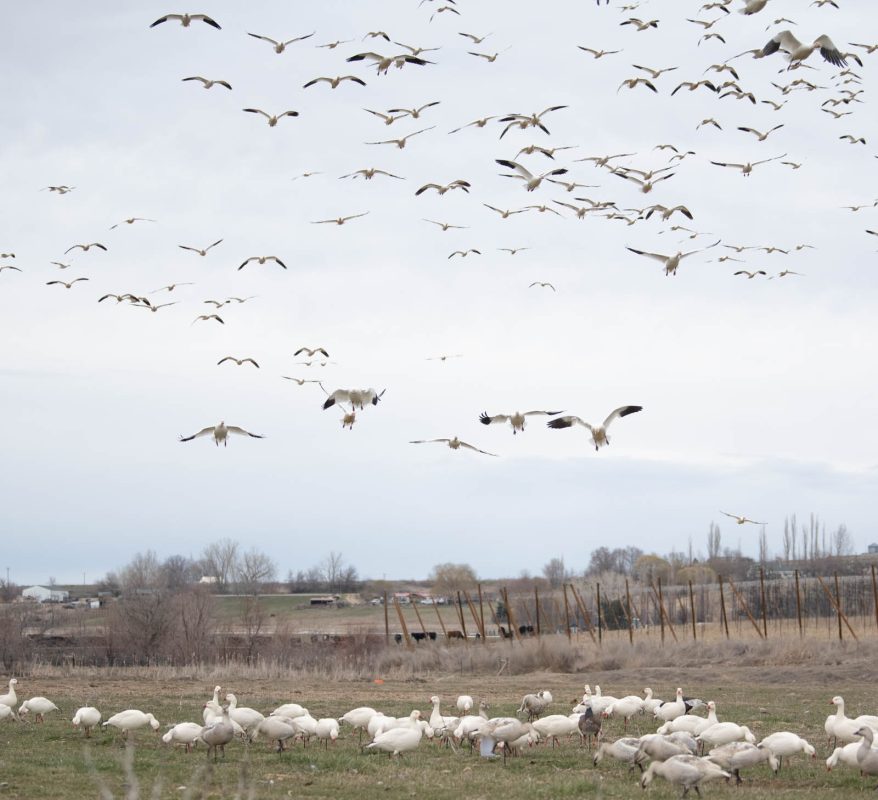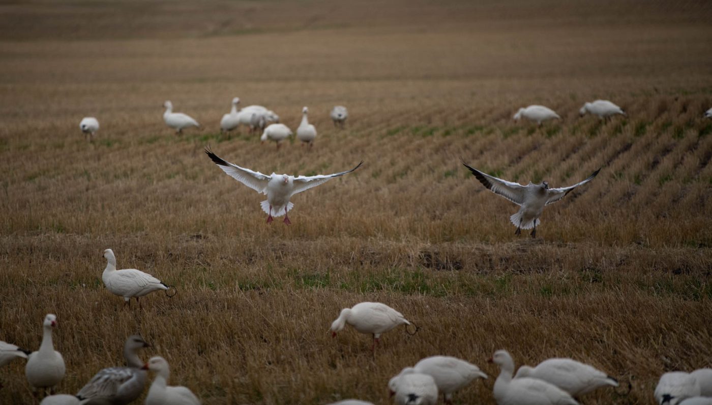 When it comes to choosing where to set up, always keep in mind how important it is to pick a spot with the best hide possible. Obviously being on an X is the primary concern, but there are other considerations as well. With the average age of a snow goose being in the ballpark of twenty years old, there’s no doubt that they know what to look for to bust an eager hunter who paid too little attention to blind location and camouflage. I prefer to hide just outside the spread in these circumstances, and find myself drawn to large bales, tall field edges, or anything that can break up an outline or cast a shadow on our hide. Some of my favorite hunts have been September afternoons in baled wheat fields in Saskatchewan, hiding one man to a round bale and picking off adult snows and ross geese in small flocks. Just as with specklebellies or cranes (the two species I rank highest for visual acuity) it’s absolutely vital to avoid movement in the hide. Lying perfectly still and concealing movement and hunters’ faces is a huge part of being successful. If birds are flaring and there’s nothing obviously wrong with the spread, check your hide! I can’t emphasize this enough: no matter the spread you have, no matter how many birds may have been there mere hours before, you will never be successful with a poor hide.